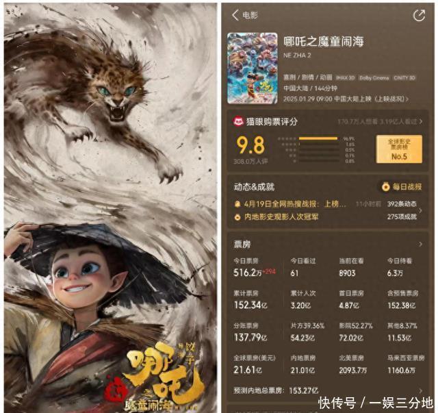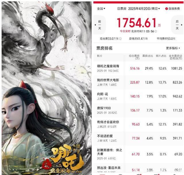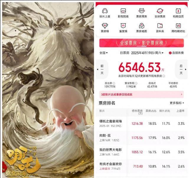 小哪吒,你这是要上天啊! 4月19日,上映80多天的《哪吒之魔童闹海》果然凭借1216万的票房,再次拿下日票房冠军。 这一出东谈主料念念的"神操作",不仅让《有病才会可爱你》等5部新片集体下跪,就连前期大热的《曙光·花》《我的天下大电影》也难逃一劫。谁能念念到,156亿的票房还不成知足这位不屈老的魔童呢? 从客岁大年月吉上映,到如今已是盛夏时节,小哪吒这百日刚过半,票房就已冲破156亿,