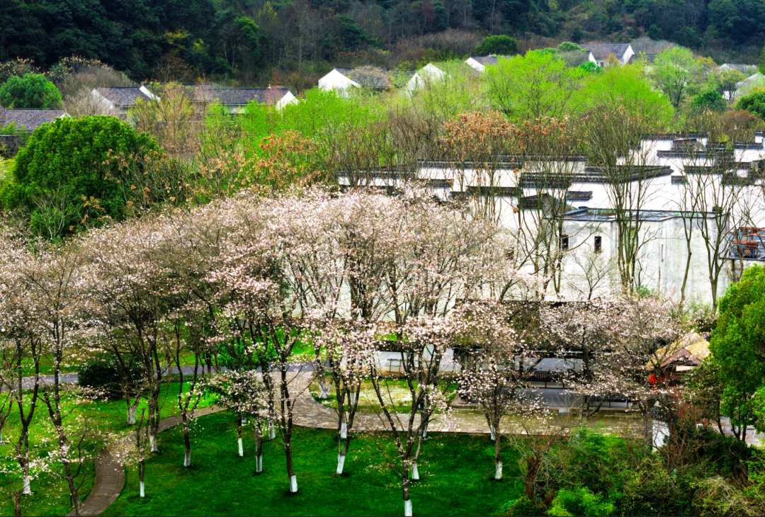 兰亭璞燊的屋子是黛瓦白墙的明清古建筑。风一吹,樱花的粉色花雨轻轻落在屋檐上。那一刻,你会昭彰什么叫诗意。
