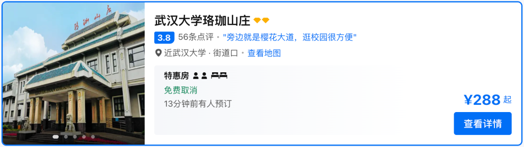 愈加良心的是,哪怕在樱花季,珞珈山庄也只须288元一晚。