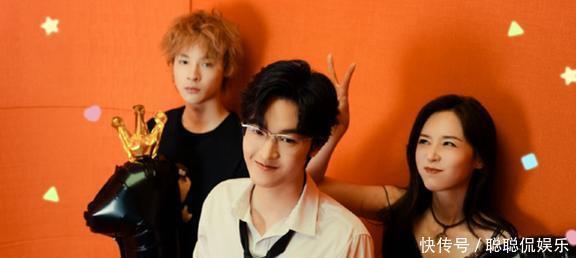 他衣着孤苦黑,站在中间和女友还有韩雯雯合影。