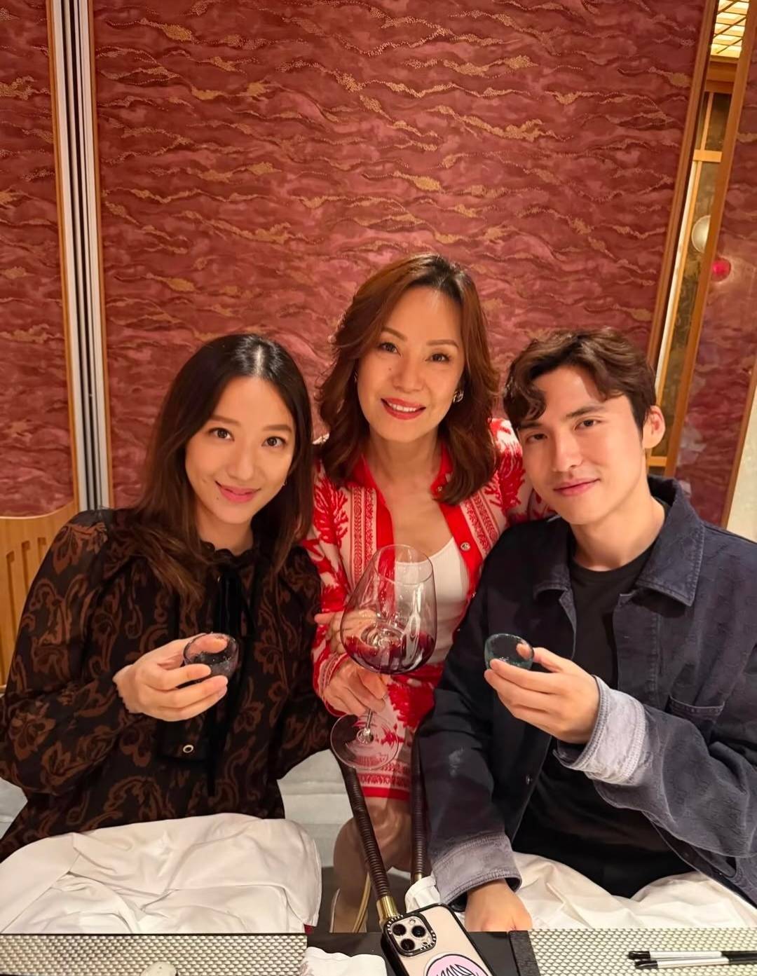 另外一张三东谈主照里,汪徐莉君坐在中间位置,笑的幅度更大,汪圆圆和蔡加赞鉴别坐在她傍边,佳偶俩笑的作为齐很像。