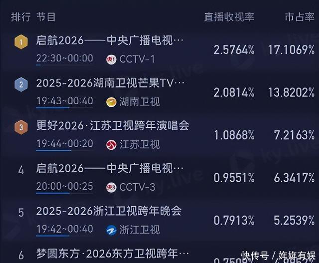 剪辑|筱晓 2025年12月31日的夜晚,中国电视荧屏上演了一场无声的战争。 当零点的钟声敲响,各大卫视纷繁交出了一份跨年的收获单。
