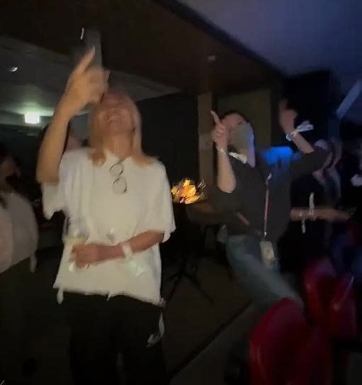 听到歌曲《玉蝴蝶》在演唱会上响起,王菲终于站起来了,当其他东说念主都在拍视频时,王菲独自嗨了起来。