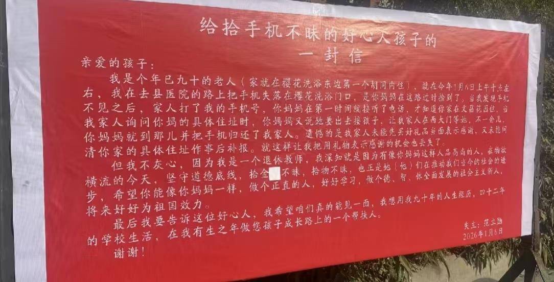 9日下昼,极目新闻记者关连上范老,他告诉极目新闻记者,我方91岁了,不谨防丢失的是一部小米智高手机,没思到能这样快找回。拿回手机后他十分昂扬,今日连午觉王人没睡就写下了这封感谢信,发给告白公司打印出来,第二天便拿到好心东谈主地点的小区张贴。“之是以写给好心东谈主的孩子,是因为孩子是故国的异日,姆妈的动作十分崇高,但愿能为孩子招引榜样。”范老说,他但愿大概找到这位好心东谈主,并迎面暗意感谢。
