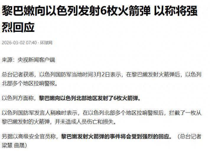 2026年3月2日,黎巴嫩真主党武装从黎巴嫩南部向以色列辐射火箭弹,这是自2024年11月以色列-黎巴嫩息兵以来,初度向以色列北部辐射火箭弹。黎巴嫩真主党武装称,本次火箭弹病笃是要为哈梅内伊复仇,打击筹谋是海法以南的一处导弹提防要领。