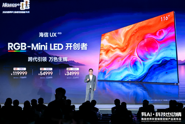 海信UX 2026款推出85、100、116英寸三大黄金规格,精确中意不同家庭的空间与体验需求,零卖价离别为34999元、54999元、119999元。