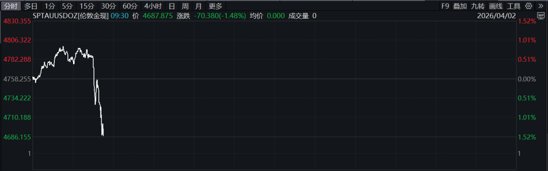 贵金属板块集体低开,晓程科技低开近4%,西部黄金、湖南白银均低开超1%。讯息面上,特朗普发表伊朗干戈话语后,WTI原油龙套103好意思元/桶,日内涨4.07%。布伦特原油日内大涨4好意思元,报102.86好意思元/桶,涨幅4.06%。贵金属跳水,现货黄金跌逾1%,报4687.87好意思元/盎司。